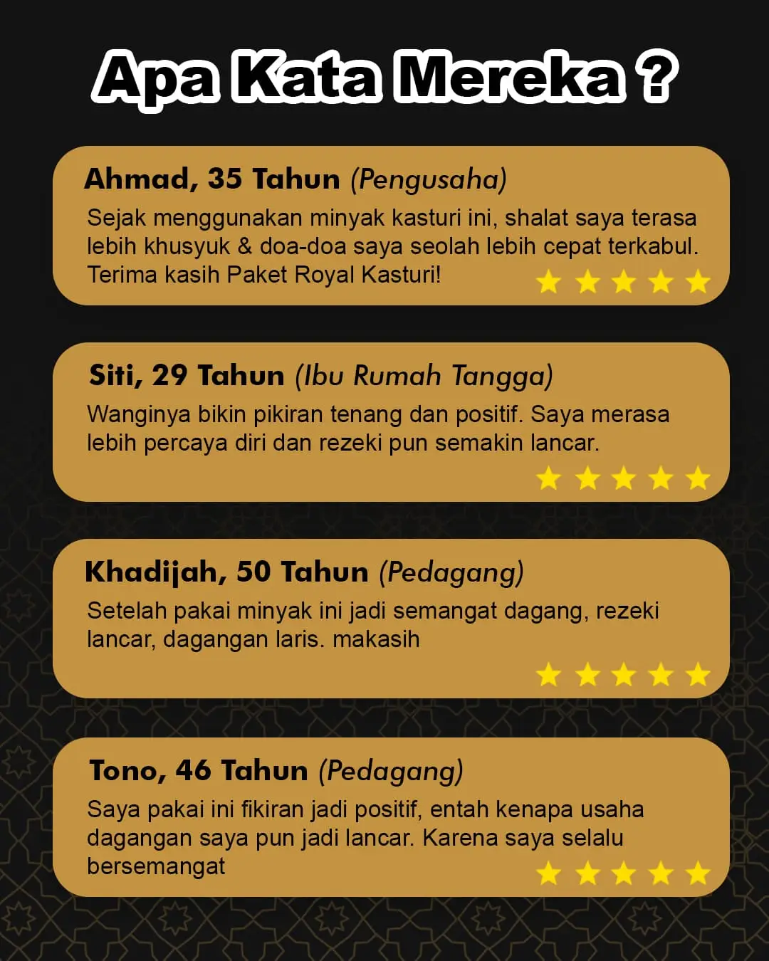 Royal Kasturi Parfum Sultan tk ver2Uncategorized·February 15, 2025February 15, 2025 Rp 298.000,- Rp 135.000,- Diskon Terbatas!! 00 HARI 00 JAM 00 MENIT 00 DETIK PROMO HARGA ROYAL KASTURI PREMIUM1 PAKET LENGKAP HANYA Rp.135.000(Isi 5 Minyak Kasturi Sultan + Buku Amalan Dzikir + Tasbih Premium) Hubungi Customer Service