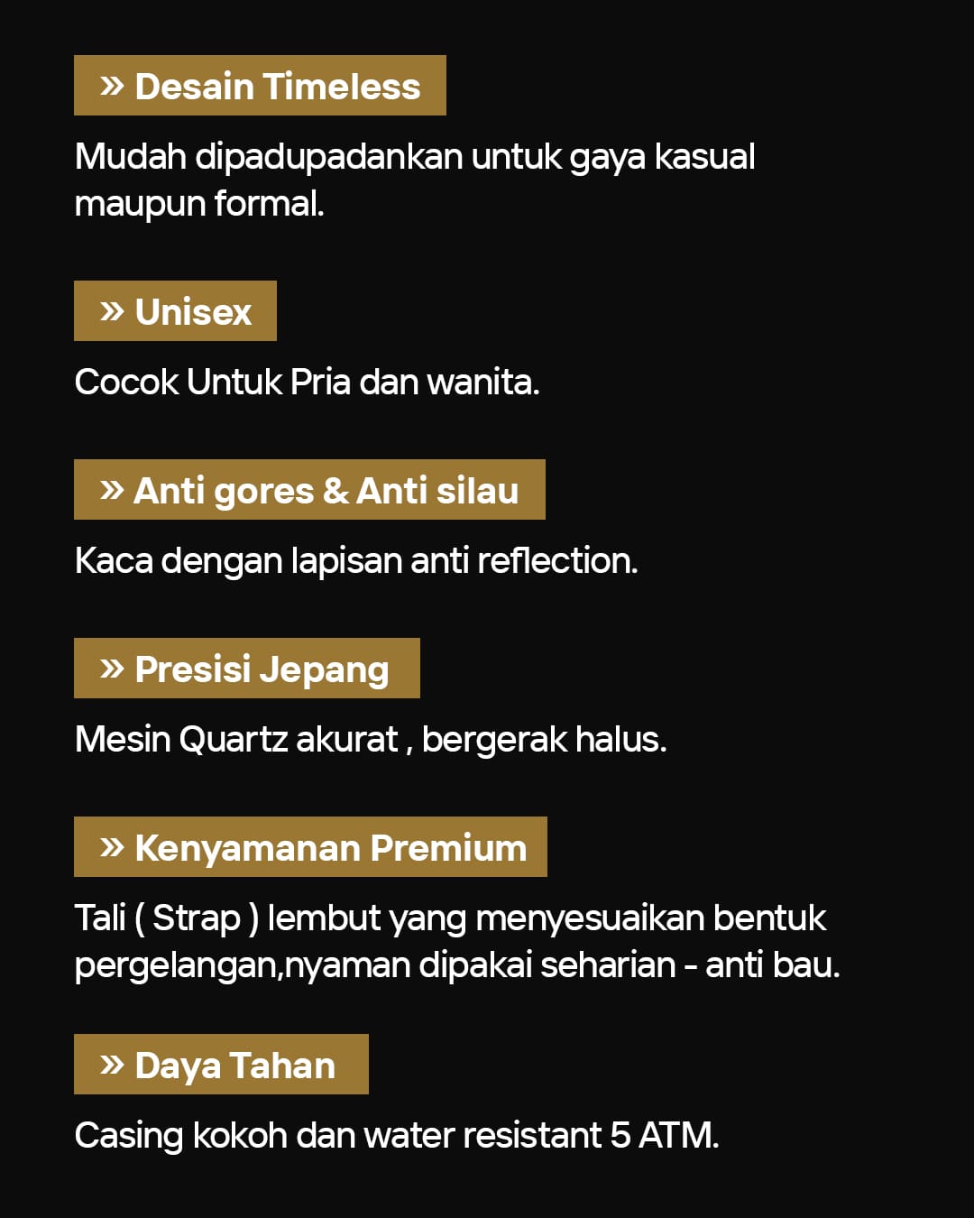 Ada beberapa keunggulan dari jam tangan luxury ini pertama menggunakan Case stainless steel dengan finishong glodd dan Dial warna hitam elegan dengan indeks kristal pada jam 12, 3, 6 dan 9 di tambah dengan Mesin quart presisi tinggi dilengkapi dengan fitur display chorograph dan tanggal dengan tombol putar di bagian kanan jam untuk setingan. Strap sudah rubber leather dan water resistant jadi sangat aman ketika jam tangan terkena cipratan air.